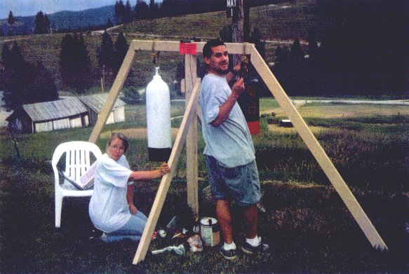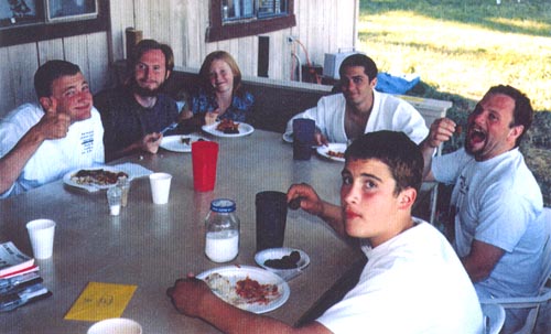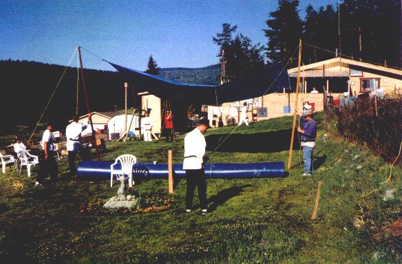 Setting up tarp A gang sets up the shade/rain tarp over mat #1.